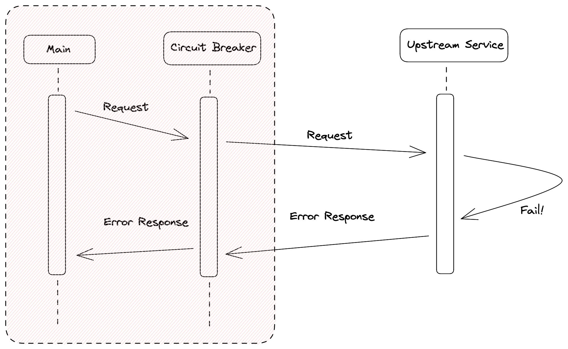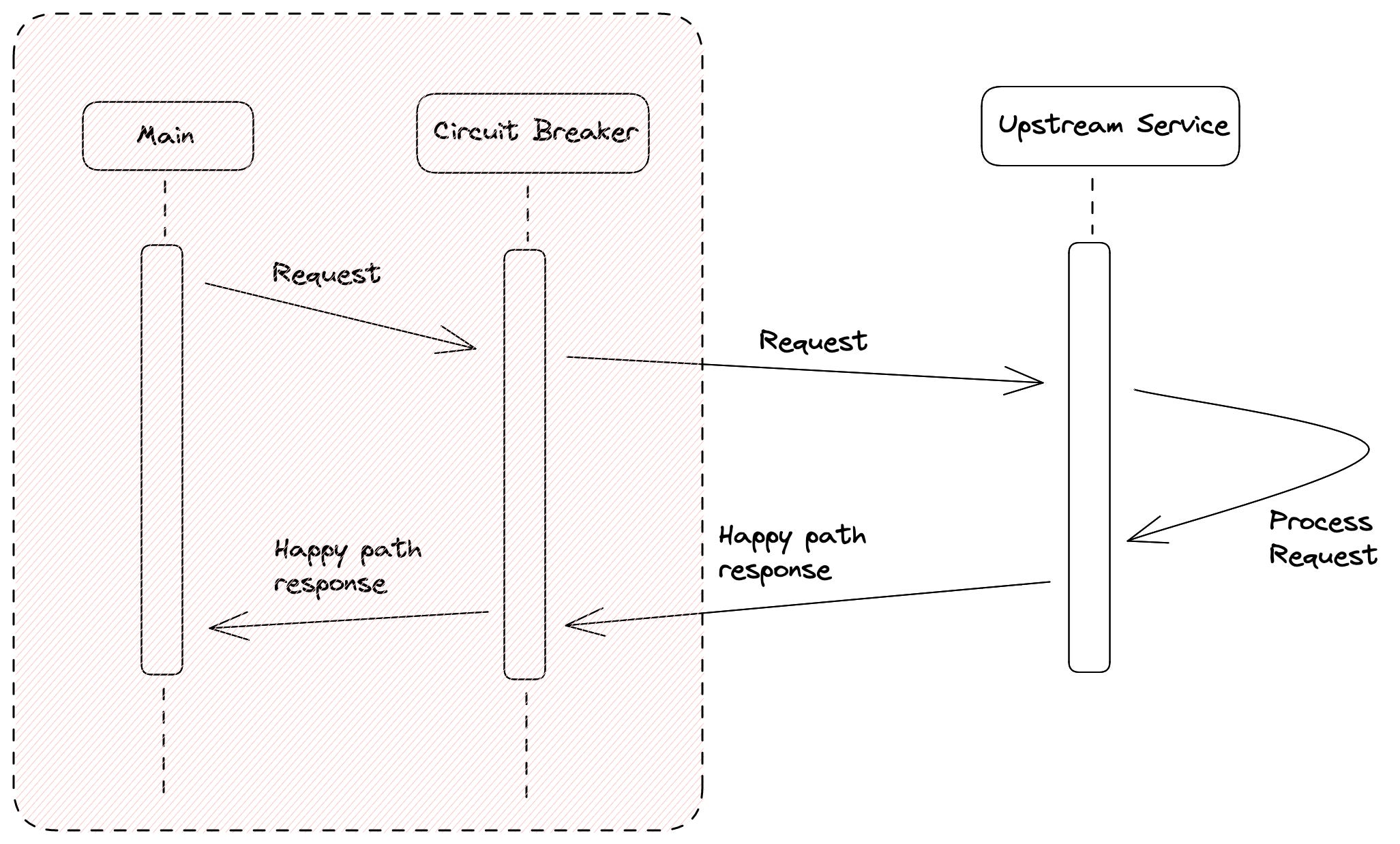 Our “main” method calls the circuit breaker, which in turns calls the upstream service. The upstream service then processes the request and returns the response to the circuit breaker, which in turn returns it to the original caller if there is no error.